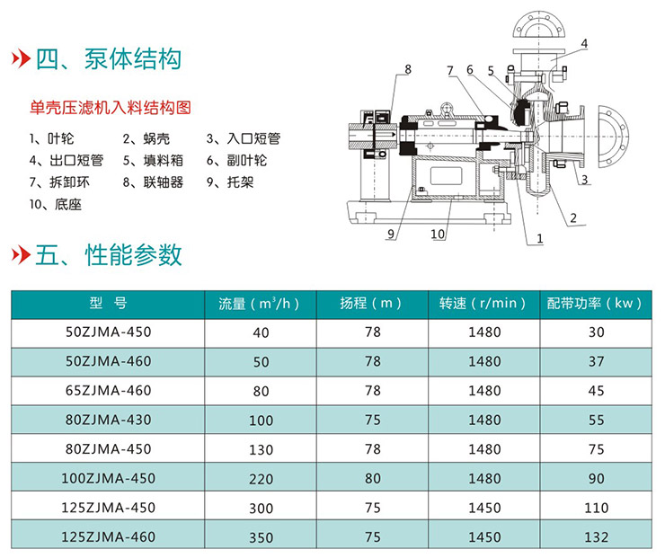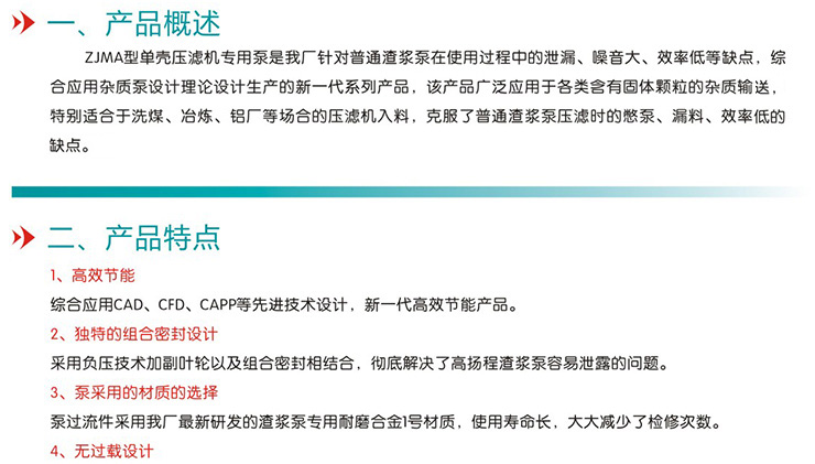 產品描述:ZJMA型單殼壓濾機專用泵是我廠針對普通渣漿泵在使用過程中的泄漏、噪音大、效率低等缺點,綜合應用雜質泵新設計理論設計生產的新一代系列產品,該產品廣泛應用于各類含有固體顆粒的雜質輸送,特別適合于洗煤、冶煉、鋁廠等場合的壓濾機入料,克服了普通渣漿泵壓濾時的憋泵、漏料、效率低的缺點。